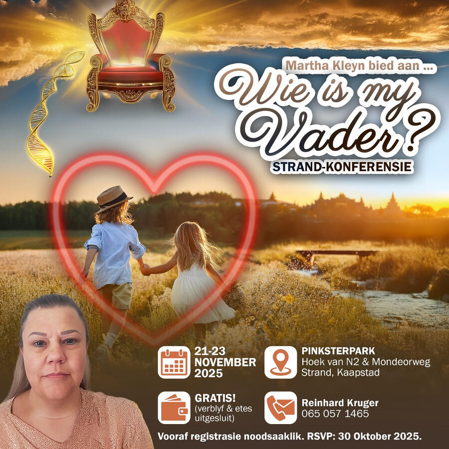 Dit is weer konferensietyd 🙌🏻🔥!Dit is my voorreg om almal uit te nooi na die konferensie 'Wie is my Vader'. 👑Dit is nou nog lekker vroeg so teken dit aan in jou dagboek en bespreek jou plekkie.21 tot 23 November.